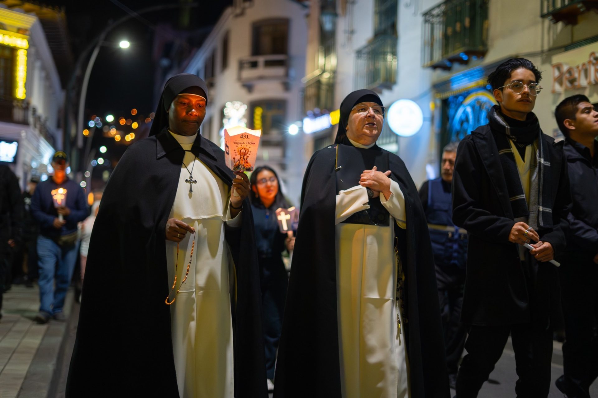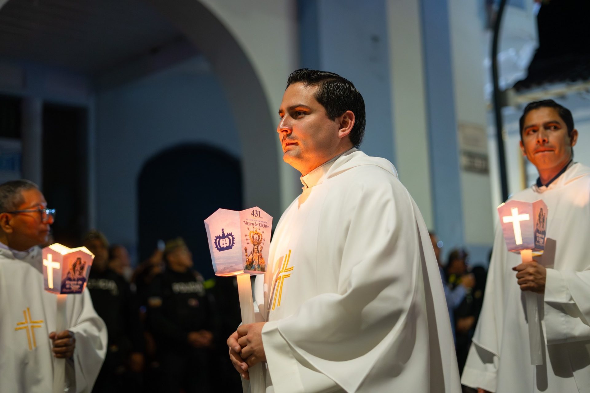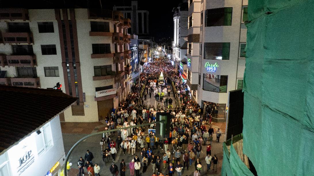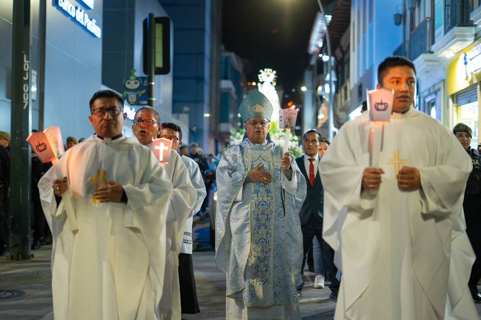 Tras la celebración litúrgica, se realizó el Lucernario Mariano, una emotiva procesión luminosa en la que los fieles, portando antorchas y velas, recorrieron las calles de la ciudad rezando y cantando el Santo Rosario. La procesión partió desde la Catedral, avanzó por la calle 18 de Noviembre, continuó por Catacocha, descendió por Miguel Riofrío y retornó al templo mayor, iluminando la noche lojana con la luz de la fe y el amor a la Madre de Dios.